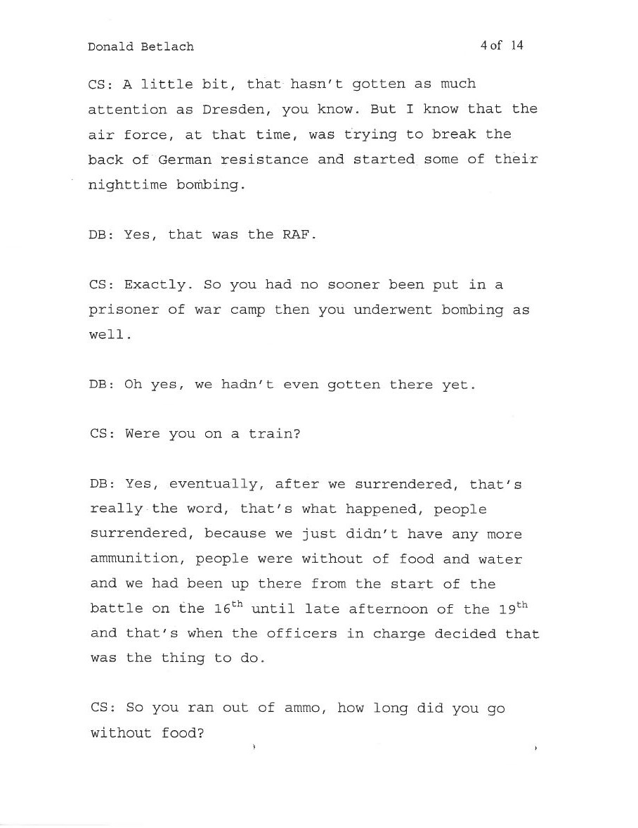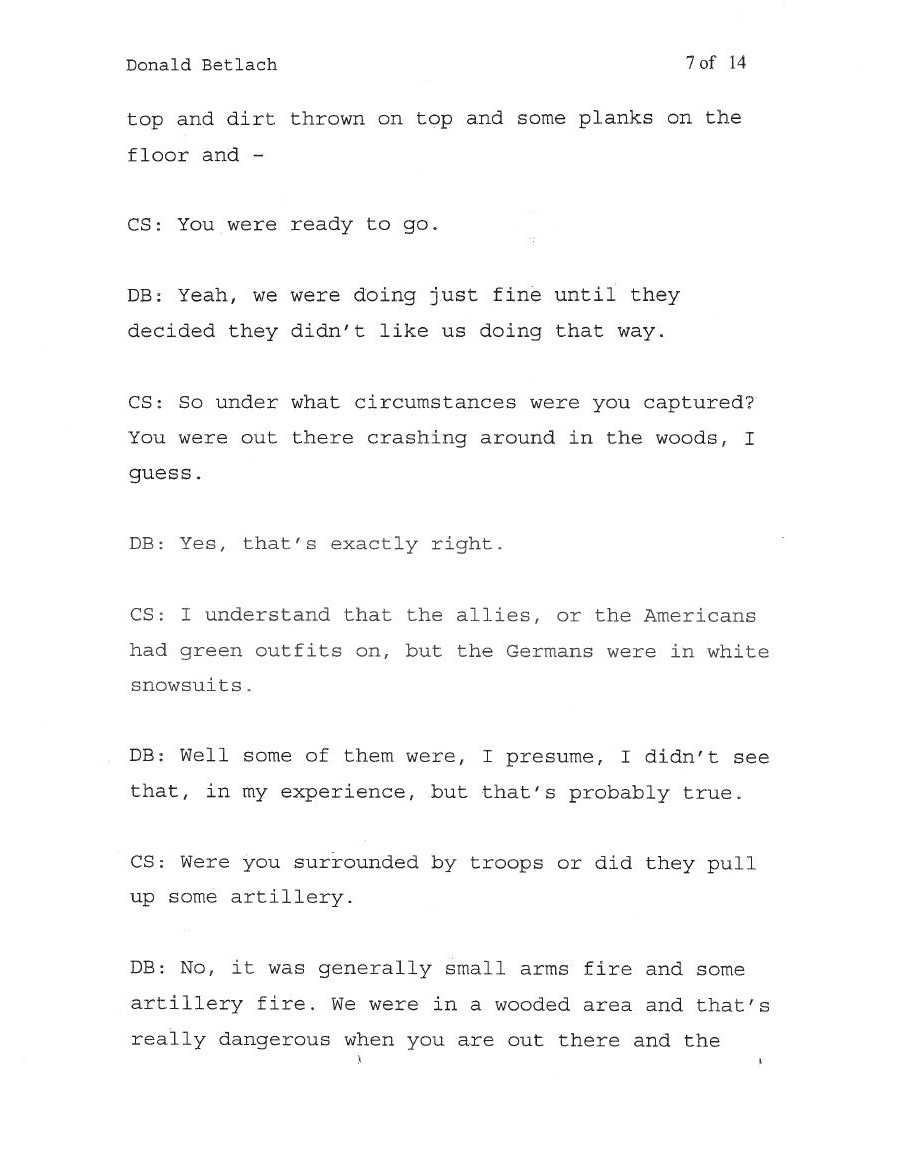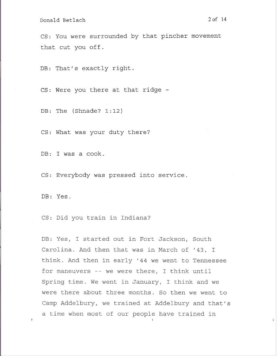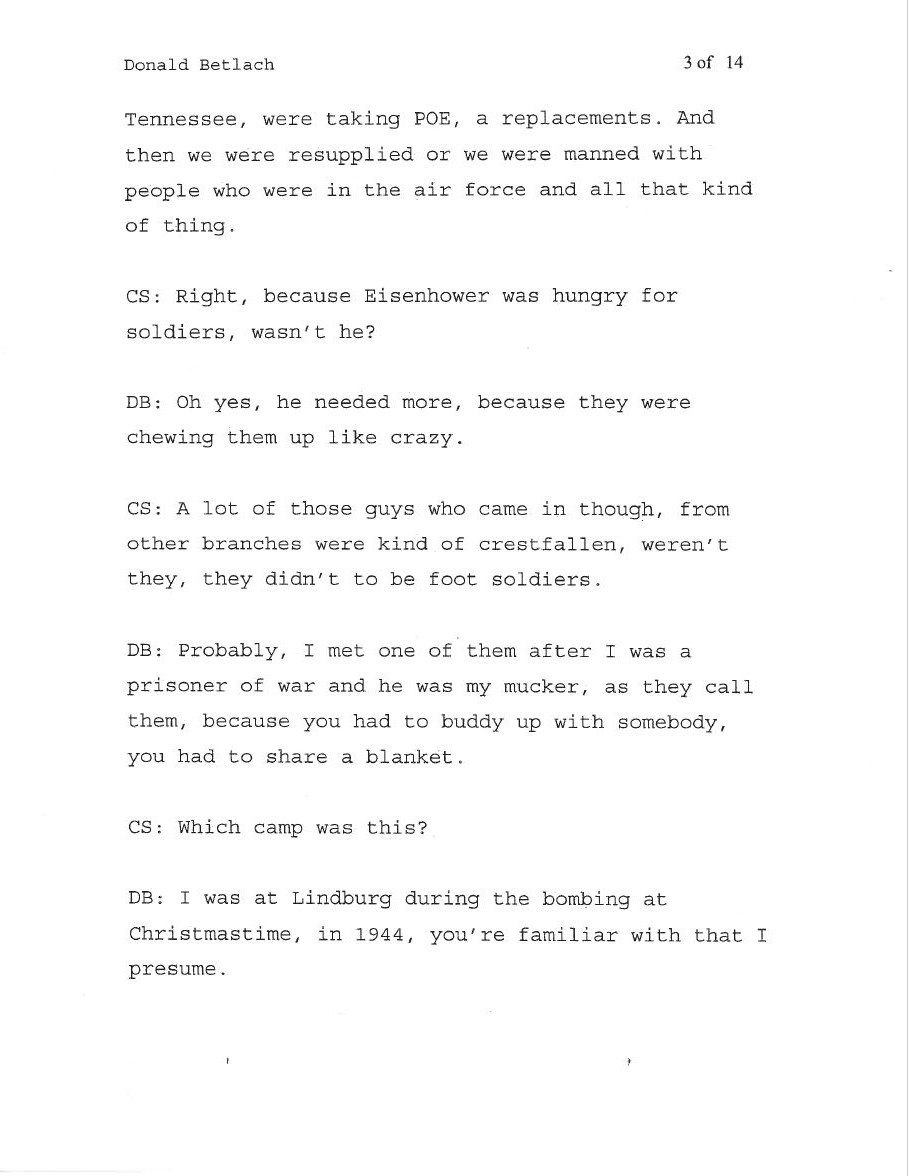 | Transcript of the interview Charles J. Shields did with Donald Betlach From the Research Collection 1939-2012 Indiana Historical Society--Thank you Amy Vedra for your help! Donald was taken prisoner during the Battle of the Bulge. Page 1 Page 2 Page 3 Page 4 Page 5 Page 6 Page 7 Page 8 Page 9 Page 10 Page 11 Page 12 Page 13 Page 14 |